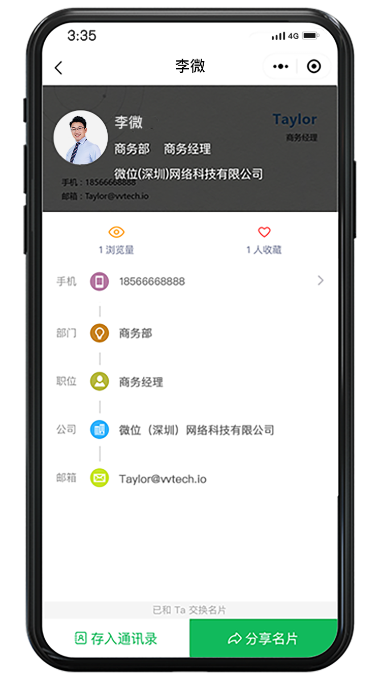 名片盒是应用BI商业智能技术的商务社交类微信小程序,在不占用手机本地存储空间的前提下,整合了名片OCR扫描识别在线派发、全局搜索、大数据透视等功能。