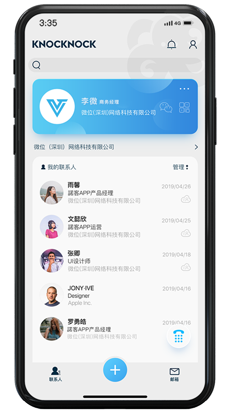 诺客将传统的系统通讯录重新打磨,智能管理名片、邮箱、通讯录联系人,打造一款真正好用的全能通讯录,协助用户实现高效移动办公。